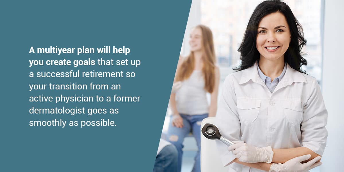 When you create a multiyear plan, you can create long-term goals for your practice. Set a timeline to complete these goals, and be sure to make necessary changes as your practice develops. A multiyear plan will also help you create goals that set up a successful retirement so your transition from an active physician to a former dermatologist goes as smoothly as possible. Planning ahead also ensures that you have enough funds to last you through retirement. Your practice, patients and finances will all be taken care of with proper planning.